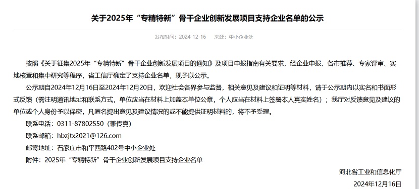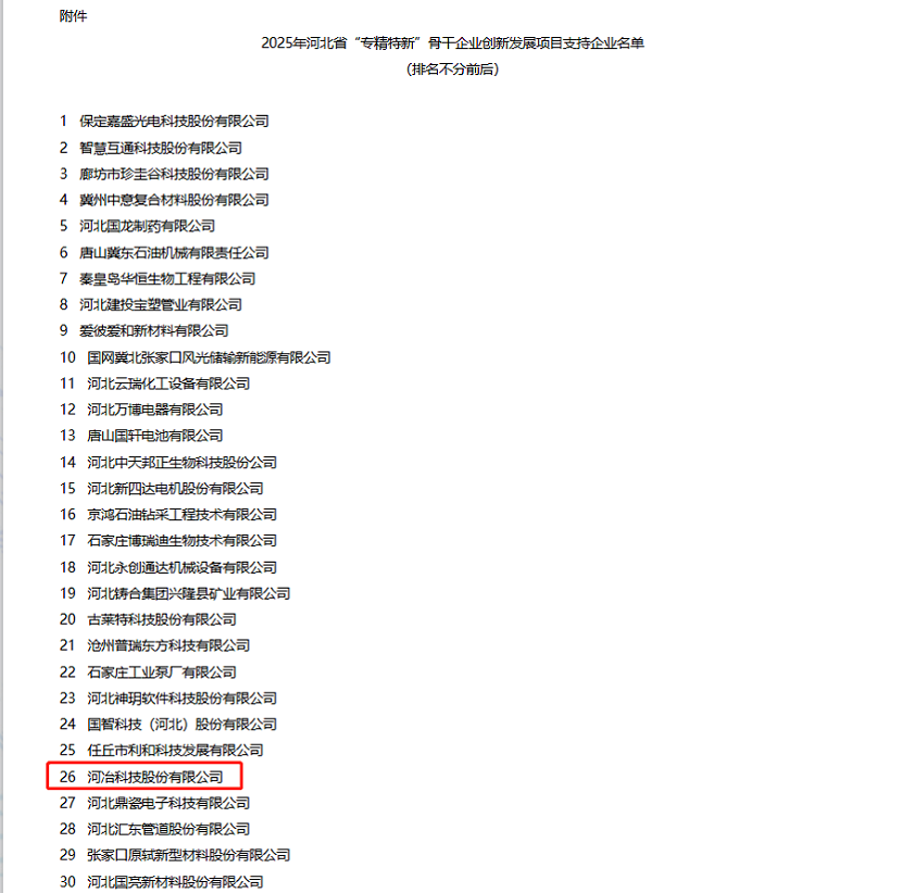 近日,公司憑借在專業(yè)領(lǐng)域內(nèi)的持續(xù)深耕與創(chuàng)新,再度榮獲河北省“專精特新”示范企業(yè)認(rèn)定。這一榮譽(yù)的再次獲得,不僅是對(duì)公司長(zhǎng)期以來堅(jiān)持專業(yè)化、精細(xì)化、特色化、新穎化發(fā)展道路的肯定,更是對(duì)公司不斷創(chuàng)新、追求卓越精神的認(rèn)可。